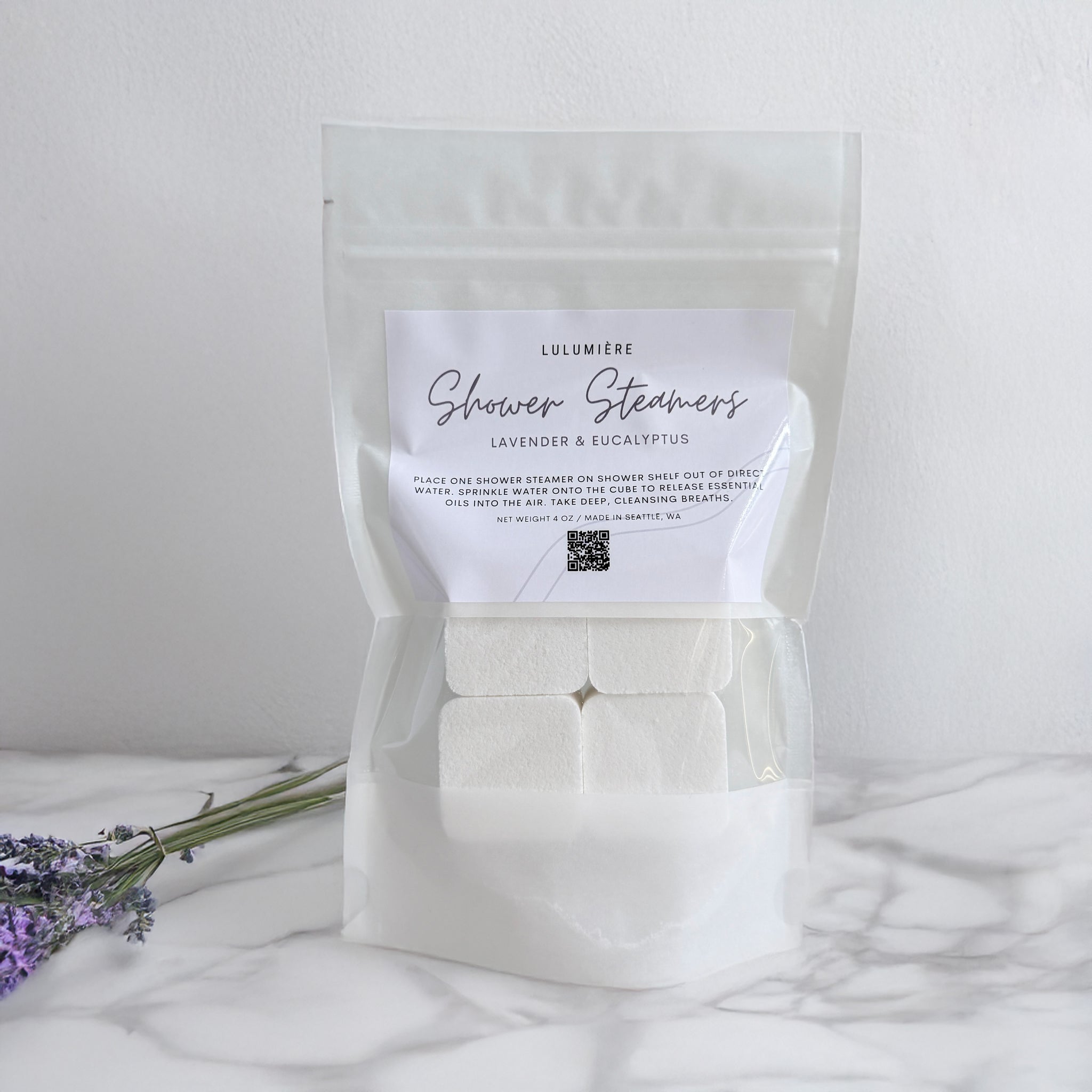 LULUMIÈRE Lavender & Eucalyptus Shower Steamers turn everyday showers into a refreshing spa experience at home. Think of them as bath bombs, but for shower people. Each tablet is made generously with 100% therapeutic grade essential oils for an organic scent you can feel good about.